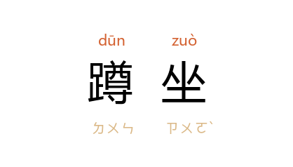 引唐 卢延让 《松寺》诗:“山寺取凉当夏夜,共僧蹲坐石阶前。”清 纪昀 《阅微草堂笔记·滦阳消夏录三》:“旁有狐十餘,各捧书蹲坐。”李劼人 《大波》第一部第三章:“小王 也提前蹲坐在一张小方桌上,用着一只汤杯喝允丰正仿绍酒。”