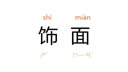 引汉 王充 《论衡·超奇》:“饰面者皆欲为好,而运目者希。”《宋史·五行志三》:“淳化 三年,京师里巷妇人竞剪黑光纸团靨,又装鏤鱼腮中骨,号‘鱼媚子’,以饰面。”