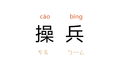 例如:「国军将士顶著烈日,在广场上操兵,勤练战技。」