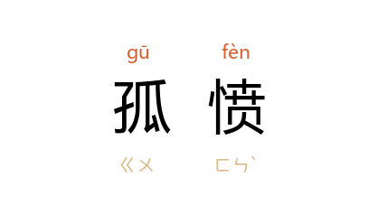 后以“孤愤”谓因孤高嫉俗而产生的愤慨之情。 唐 刘知几 《史通·自叙》:“虽任当其职,而吾道不行;见用於时,而美志不遂。鬱怏孤愤,无以寄怀。”