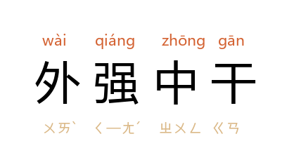 ⒈ 外表看似强壮,内实虚弱干竭。也作「外彊中干」。