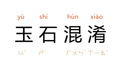 引晋 葛洪 《抱朴子·百家》:“真伪颠倒,玉石混淆。”宋 岳珂 《桯史·淮阴庙》:“﹝庙﹞两旁皆过客诗句,楹楣户牖,题染无餘,往往玉石混淆,殊不可读。”