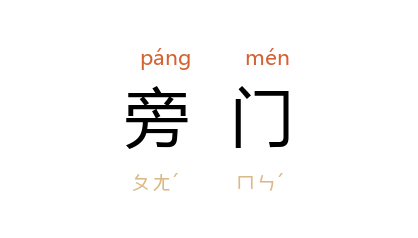 ⒈ 正门旁或整个建筑物侧面的出入口。也作「傍门」。