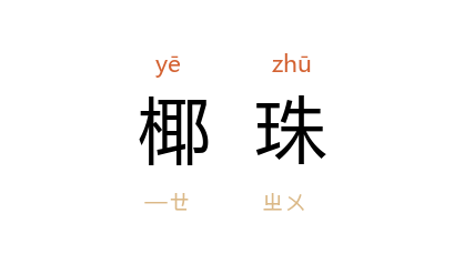 引清 袁枚 《随园诗话补遗》卷一:“近来习尚,丈夫多臂缠金鐲,手弄椰珠。”郭沫若 《读<随园诗话>札记·椰珠》:“二种‘椰珠’,一为天然结石,一为人工旋壳而成,判然有别。天然结石,其色白,极少见。人工旋壳而成者,其色黑,为数可不少。佛徒所用牟尼珠,每串多至一〇八颗或更多,其色黑,自为后者无疑。”