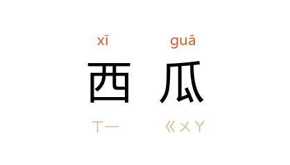 ⒈ 植物名。葫芦科西瓜属,一年生蔓草。茎多分歧,有卷须,常攀缘他物生长。叶粗硬,形似羽状复叶。夏季开淡黄色花朵,雌雄同株。果实也称为「西瓜」,为大形浆果,呈球形或椭圆形,果皮有白绿色的蛇斑,果肉通常为红色或黄色,水分多,味甜。