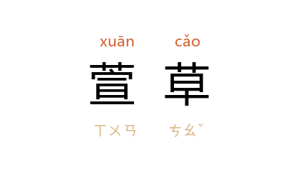 ⒈ 植物名。俗称金针菜、黄花菜、多年生宿根草本,其根肥大。叶丛生,狭长,背面有棱脊。花漏斗状,橘黄色或桔红色,无香气,可作蔬菜,或供观赏。根可入药。古人以为种植此草,可以使人忘忧,因称忘忧草。