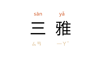 ⒈ 《太平御览》卷八四五引《典论》:“刘表有酒爵三,大曰伯雅,次曰仲雅,小曰季雅。伯雅容七升,仲雅六升,季雅五升。”后以“三雅”泛指酒器。