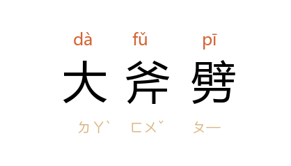 ⒈ 国画皴法的一种。点染山石,侧笔如斧劈形,用笔较疏阔者称大斧劈。 宋 李唐、马远、夏珪 等山水画多用此法。参阅 明 汪砢玉 《珊瑚网画法·皴石法》。