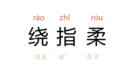 ⒉ 形容柔软的事物。唐·高适〈咏马鞭〉诗:「珠重重,星连连,绕指柔,纯金坚。」或 作「绕指柔肠」。