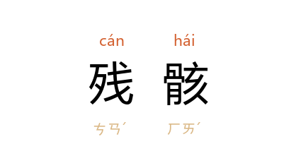 ⒈ 残留的尸骨。今亦常借指残破的建筑物及机械、车辆等。
