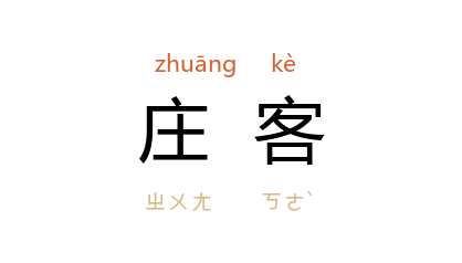 ⒈ 旧时庄田中佃农和雇农的通称。庄客除耕种外,还要服其他劳役,并负保卫田庄的责任,受庄主和庄头的双重压榨。