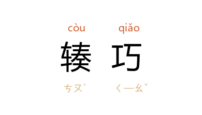引《清平山堂话本·刎颈鸳鸯会》:“这妇人羡慕 朱秉中 不已,只是不得輳巧。”《水浒传》第一回:“一来天罡星合当出世,二来 宋 朝必显忠良,三来輳巧遇着 洪信。”清 袁于令 《西楼记·乘鸾》:“寳鼎麝兰烧,满座篆烟迷了,香深深处,惊看翠围珠绕,良时輳巧,画堂中綺宴安排早。”
