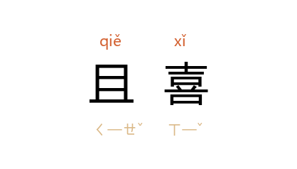 引元 无名氏 《鸳鸯被》第一折:“员外,且喜且喜,小姐説今夜晚间约定在 玉清庵 中与你赴期,教我先将的鸳鸯被来了也。”《初刻拍案惊奇》卷十七:“且喜他不装模样,见説做醮,便肯轻身出观来到我家。”《儿女英雄传》第三一回:“且喜是月半天气,还辨得出影响来。”朱德 《和董必武同志七绝》之四:“抗战连年秋復秋,今秋且喜稻如油。”