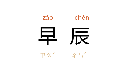 引南唐 刘崇远 《金华子杂编》卷下:“忽一日早辰,其妻少弟至妆阁问其姊起居。”《三国志平话》卷上:“当日早辰,有妻子送饭。”《初刻拍案惊奇》卷十八:“大姓只道师父在家不妨,岂知早辰一伙都不见了。”