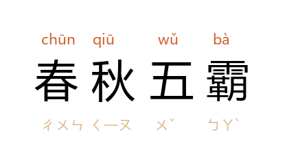 英语the Five Hegemons of the Spring and Autumn period (770-476 BC), namely: Duke Huan of Qi 齊桓公|齐桓公[Qi2 Huan2 gong1], Duke Wen of Jin 晉文公|晋文公[Jin4 Wen2 gong1], King Zhuang of Chu 楚莊王|楚庄王[Chu3 Zhuang1 wang2], and alternatively Duke Xiang of Song 宋襄公[Song4 Xiang1 gong1] and Duke Mu of Qin 秦穆公[Qin2 Mu4 gong1] or King Helu of Wu 吳王闔閭|吴王阖闾[Wu2 wang2 He2 Lu:2] and King Gou Jian of Yue 越王勾踐|越王勾践[Yue4 wang2 Gou1 Jian4]