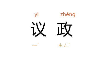 引汉 王充 《论衡·效力》:“治书定簿,佐史之力也;论道议政,贤儒之力也。”宋 韩元吉 《读<管子>》:“则 仲 之与 桓公 平日谋国议政者,其亦详矣。”《清史稿·太宗纪二》:“﹝ 崇德 二年夏四月﹞丁酉,命固山贝子 尼堪、罗託、博洛 等预议国政。增置每旗议政大臣三人,集羣臣諭之曰:‘向者议政大臣额少……今特择尔等置之议政之列,当以民生休戚为念,慎勿怠惰,有负朝廷。’”