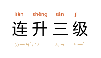 引《禅真逸史》第十一回:“不论军民人等,如有擒获者,该地方官给赏银三百两,本官连升三级。”李炎錩 《民国官场笑林·不打不升》:“如果服服帖帖,毫无怨言者,则立即升职升级,甚至还会连升三级。”