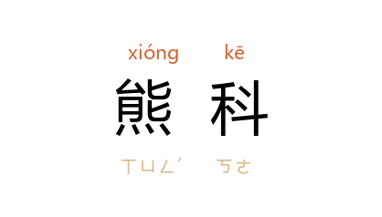 ⒈ 通称“熊”。哺乳纲食肉目的一科。体躯粗壮、肥大,吻部较长,尾短小,体长5熊科2米,体重约100熊科400千克;四肢强有力,用足掌行走;臼齿发达,是食肉目中大型杂食性动物。广布于欧洲、亚洲和北美洲。如黑熊、棕熊、白熊等。