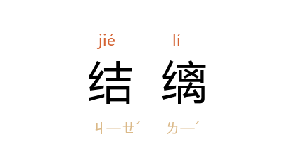 ⒈ 本指女子出嫁时,母亲为女儿系上佩巾,并谆谆教诲的仪式。语本后用以告诫子女。汉·马援〈诫兄子严敦书〉:「施衿结缡,申父母之戒,欲使汝曹不忘之耳。」亦泛指结婚。唐·权德舆〈鄜坊节度使推官大理评事唐君墓志铭〉:「结缡周月,遭罹柏舟之痛。」也作「结褵」。