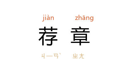 引宋 曾巩 《送宣州杜都官》诗:“荐章交论付丞相,士行如此宜名卿。”宋 张孝祥 《水调歌头·送谢倅之临安》词:“圣天子,方侧席,选豪英。日边仍有知己,应剡荐章间。”清 赵翼 《读方于诗》诗:“处处乞荐章,誓以杀身报。”