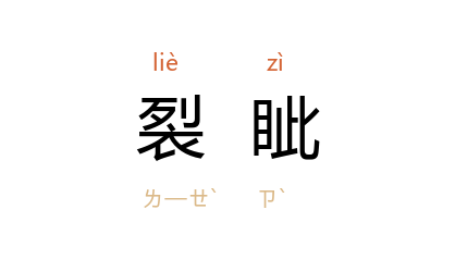 ⒈ 见“裂眦”。亦作“裂眥”。谓因发怒而眼睛睁得极大,眼眶似乎要裂开。形容极其愤怒的神态。