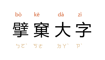引宋 惠洪 《冷斋夜话·东坡属对》:“又登 望海亭,柱间有擘窠大字。”《明史·文苑传四·王稚登》:“四岁能属对,六岁善擘窠大字。”闻一多 《一个白日梦》:“那威风凛凛的稻草人式的构造物,和它上面更威风的蓝地白书的八个擘窠大字:顶天立地,继往开来。也不知道是出自谁人的手笔。”