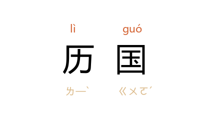引汉 刘歆 《移书让太常博士》:“是故 孔子 忧道不行,歷国应聘,自 卫 反 鲁,然后乐正。”宋 苏轼 《次韵子由与孔常父唱和》:“虽非蒙倛状,尚有歷国苦。”明 何景明 《鲁连》诗:“仲连 初歷国,排难能解纷。”