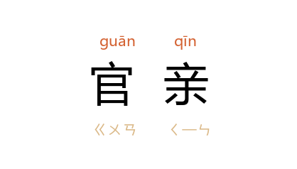 引《儿女英雄传》第三七回:“不想他一朝作了官亲,福至心灵,这几句官话儿倒误打误撞的説了个合折押韵。”清 冯桂芬 《与李方赤太守书》:“无论大小衙门、官亲幕友、长随吏役人等,不得擅啟。”《二十年目睹之怪现状》第七回:“他那些甚么外甥咧、表侄咧,闻得他做了官,便都投奔他去做官亲。”