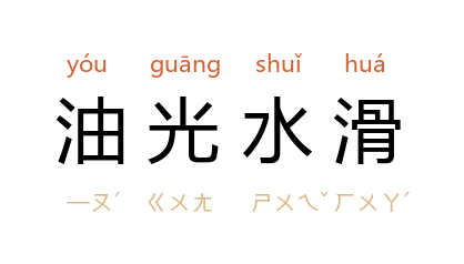 ⒈ 形容光滑润泽。形容人的圆滑、狡诈。