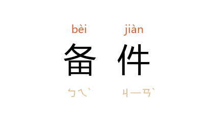 ⒈ 预备着供更换的零件或部件。又叫配件。