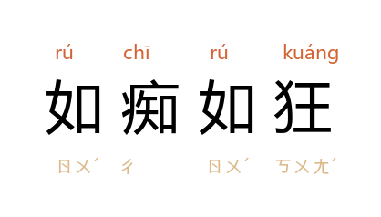 ⒈ 形容人神态失常,到了无法自制的地步。也作「如醉如狂」。