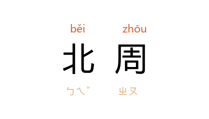 ⒈ 朝代名。 北朝 之一。公元557年初 宇文泰 子 宇文觉 代 西魏 称帝,国号 周,都 长安 (今 陕西 西安 ),史称 北周,亦称 后周。公元577年灭 北齐,统一 中国 北方。公元581年为 隋 所代。共历五帝,二十五年。