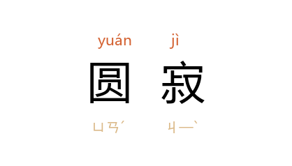 ⒈ 佛教用语:(1) 修行人灭除烦恼,不再生死轮回的境界。尤其指证悟解脱的佛或阿罗汉的去世。〈一百五十赞佛颂〉:「栗粒以分身,尔乃居圆寂。」也作「涅槃」、「寂灭」。(2) 中国一般习惯称出家人的去世。也作「灭度」、「涅槃」。