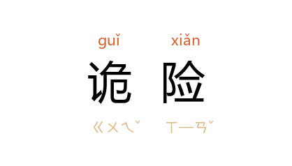 引《新唐书·崔湜传》:“其( 崔湜 )猜毒诡险殆天性,虽蠆虺不若也。”宋 文莹 《玉壶清话》卷九:“金陵 司马 徐玠 者,性诡险,深忌於主,屡讽 温 曰:‘辅政之权,不宜假也,请以嫡子 知询 代之,以收其势。’”清 王夫之 《读通鉴论·宋武帝二》:“谢晦、傅亮 之流,抑诡险而无定情。”