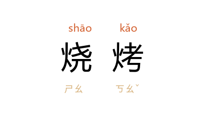 ⒉  经火烘烤的食物,通常将肉类或海鲜放在火上,一面烤,一面涂上酱料。