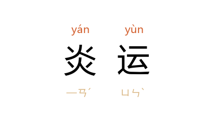 引南朝 陈 徐陵 《劝进梁元帝表》:“至於金行重作,源出 东莞 ;炎运犹兴,枝分 南顿。”唐 李百药 《赋得魏都》:“炎运精华歇,清都寳命开。”宋 李纲 《论使事札子》:“炎运中微,夷狄乱常,驯致 靖康 之变,国祚几絶。”清 龚自珍 《<瓦录>序》:“嘻!可以识炎运之西隆,窥 刘 祚之东替矣。”