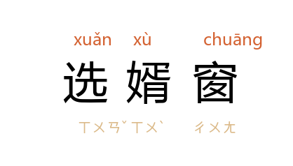 ⒈ 唐 李林甫 有女六人,相传 林甫 常令其女于宝窗下嬉戏,每有贵族子弟入谒,使女于窗中窥视,自选可意者事之。谓之“选婿窗”。见 五代 王仁裕 《开元天宝遗事·选婿窗》。