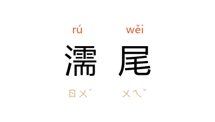 ⒈ 语出《易·未济》:“小狐汔济,濡其尾,无攸利。”孔颖达疏:“小才不能济难事,同小狐虽难渡水而无余力,必须水汔方可涉川;未及登岸而濡其尾,济不免濡,岂有所利?”后以“濡尾”比喻力不胜任,处境尴尬。