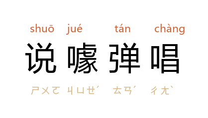 ⒈ 苏州评弹的四种基本技巧。“说”指叙说故事,包括以第三者口吻叙事的表白和模拟故事中人物的说白;“噱”指噱头,即引人发笑;“弹”指弹奏乐器;“唱”指唱功。随着苏州评弹表演中“起脚色”成分的增加,又有“说噱弹唱演”一说。“演”通常指运用虚拟动作表演人物。