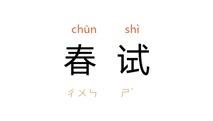 ⒈ 唐 代考试定在春夏之间。 宋 诸路州军科场并限八月引试,而礼部试士,常在次年的二月,殿试则在四月;于是有春试、秋贡之名。 元 代于八月乡试,二月会试, 明 清 相沿。故也称会试为春试。参阅《宋史·选举志二》、 清 赵翼 《陔馀丛考·试期》。