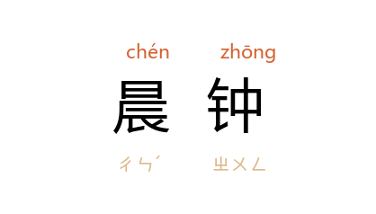 引北周 庾信 《陪驾幸终南山和宇文内史》:“戍楼鸣夕鼓,山寺响晨鐘。”唐 杜甫 《游龙门奉先寺》诗:“欲觉闻晨鐘,令人发深省。”五代 牛希济 《临江仙》词之一:“月斜江上,征棹动晨鐘。”郭沫若 《女神·女神之再生》:“太阳虽还在远方,海水中早听着晨钟在响:丁当,丁当,丁当。”