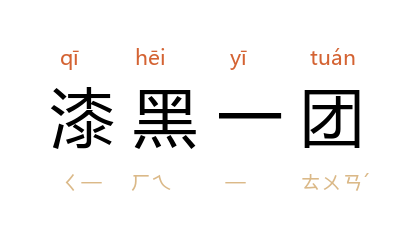 ⒉ 形容没有一点光明、希望,或是对人对事一无所知。也作「黑漆一团@@@一团漆黑」。