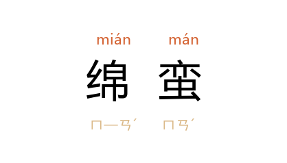 ⒉ 《诗·小雅·绵蛮》:“绵蛮黄鸟,止于丘阿。”毛传:“绵蛮,小鸟貌。”朱熹集传:“绵蛮,鸟声。”王国维《观堂集林·尔雅草木虫鱼鸟兽名释例下》:“虫之小者曰蠛蒙,鸟之小者亦曰绵蛮,殆皆微字之音转。”《文选·何晏〈景福殿赋〉》:“绵蛮黮?。”李善注:“《韩诗》曰:'绵蛮黄鸟',薛君曰:'绵蛮,文貌。'”历来诗文中多用小鸟、鸟声二说。指小鸟或鸟鸣声。
