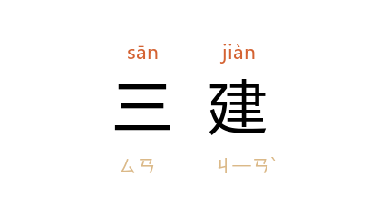 引《宋书·谢灵运传》:“二冬并称而殊性,三建异形而同出。”原注:“三建者,附子、天雄、乌头。”明 李时珍 《本草纲目·草六·天雄》﹝集解﹞引 陶弘景 曰:“天雄似附子,细而长,乃至三四寸许。此与乌头、附子三种,本出 建平,故谓之三建。”宋 范成大 《问天医赋》:“三建若燎,五毒若螫。入口如荼,下咽如戟。”