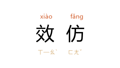 引柳青 《狠透铁》:“不是各户社员的家庭积肥值得全社效仿啊。”仿效;学着做。 明 谢肇淛 《五杂俎·人部三》:“至今乡曲以为话柄,然转相傚倣者不无其人也。”胡蕴玉 《<中国文学史>序》:“嗟夫!傚倣得古人之皮毛,揣摹窥主司之好尚,论者谓科举盛而文学衰,殆其然乎!”