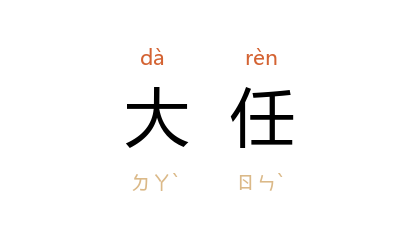 引《左传·成公十六年》:“国有大任,焉得专之。”杜预 注:“大任,谓元帅之职。”《北齐书·神武帝纪下》:“少能剧饮,自当大任,不过三爵。”清 昭槤 《啸亭杂录·裘文达公》:“公听视机警,受大任举重若轻。”