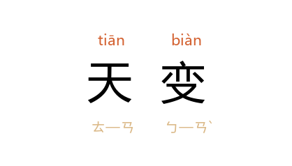 引《史记·天官书》:“所见天变,皆国殊窟穴,家占物怪,以合时应,其文图籍禨祥不法。”《京本通俗小说·拗相公》:“民间怨声载道,天变迭兴。”清 俞樾 《茶香室三钞·岁在甲寅多乱》:“不有天灾,必有天变;不有天变,必有盗贼。”