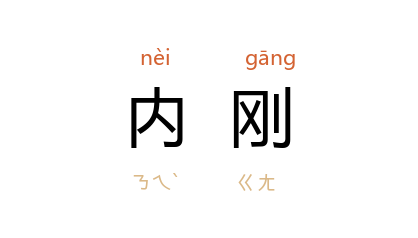 引《易·坎》“行有尚” 三国 魏 王弼 注:“内亨外闇,内刚外顺,以此行险,行有尚也。”宋 欧阳修 《再论水灾状》:“祠部员外郎直史馆知襄州 张瓌 静默端直,外柔内刚,学问通达。”明 李东阳 《明故中顺大夫南京大常寺少卿掌尚宝司事夏公行状》:“公为人宽厚简易,内刚外和。”