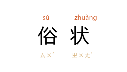 引南朝 齐 孔稚珪 《北山移文》:“尔乃眉轩席次,袂耸筵上,焚芰製而裂荷衣,抗尘容而走俗状。”清 蒋士铨 《第二碑·上塚》:“卑职竭蹶簿书,未遑侦访,今蒙垂问,自觉俗状尘容,有惭风雅。”
