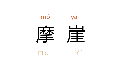 ⒈ 刻在山崖石壁上的碑文、经文、佛像、诗赋等。因崖壁凹凸不平,所刻文字无法整齐统一,反而形成雄伟豪放的独特风格。由于崖壁粗糙,经年暴露于外,受风雨侵蚀,所以今所见的摩崖书笔致多圆劲浑厚而少方峻,如〈汉石门颂〉、〈唐舜庙碑〉便是。